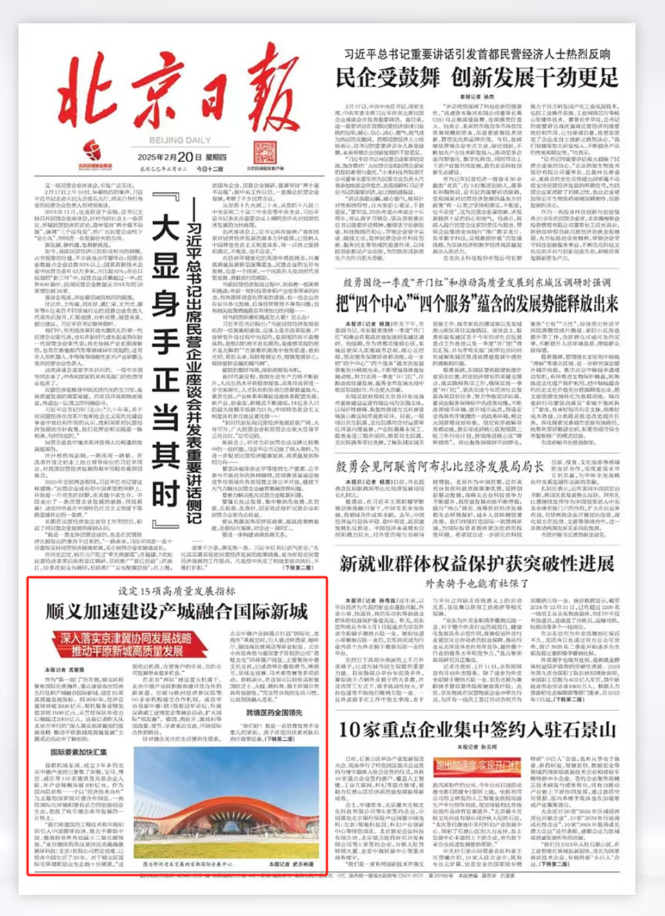 《北京日报》刊发的《顺义加速建设产城融合国际新城》一文,通过国际要素汇集、跨境医药领先、高精产业集聚三大亮点,生动展现了顺义在新能源智能汽车、航空航天、第三代半导体、智能装备、医药健康等多个领域的蓬勃发展态势。