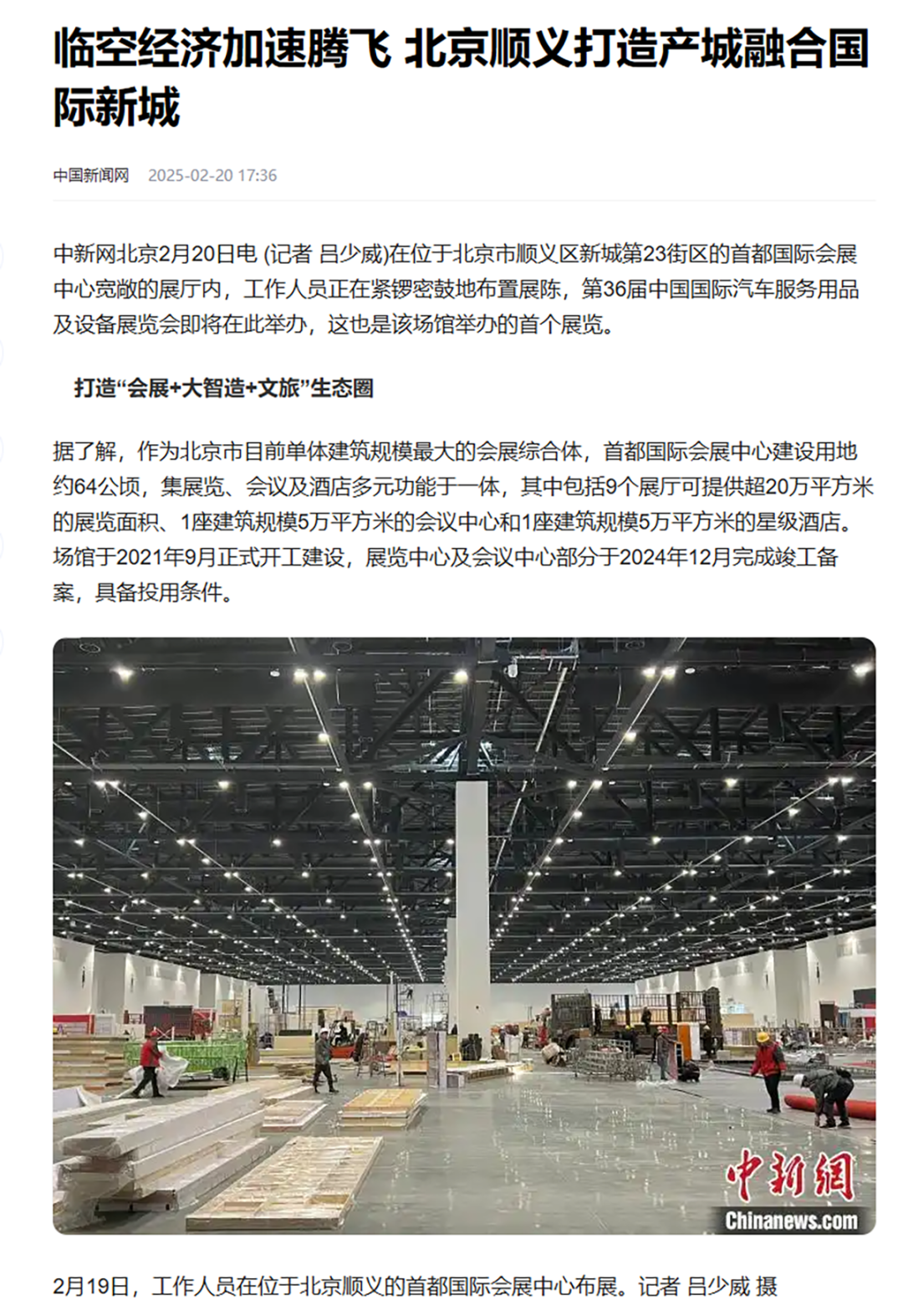 新华社19日刊发的报道《北京顺义:首都国际会展中心将迎首展》,展示了顺义会展经济的发展成果。文中介绍了首都国际会展中心的建设情况,通过多张现场照片,展现了首展布展的情况。