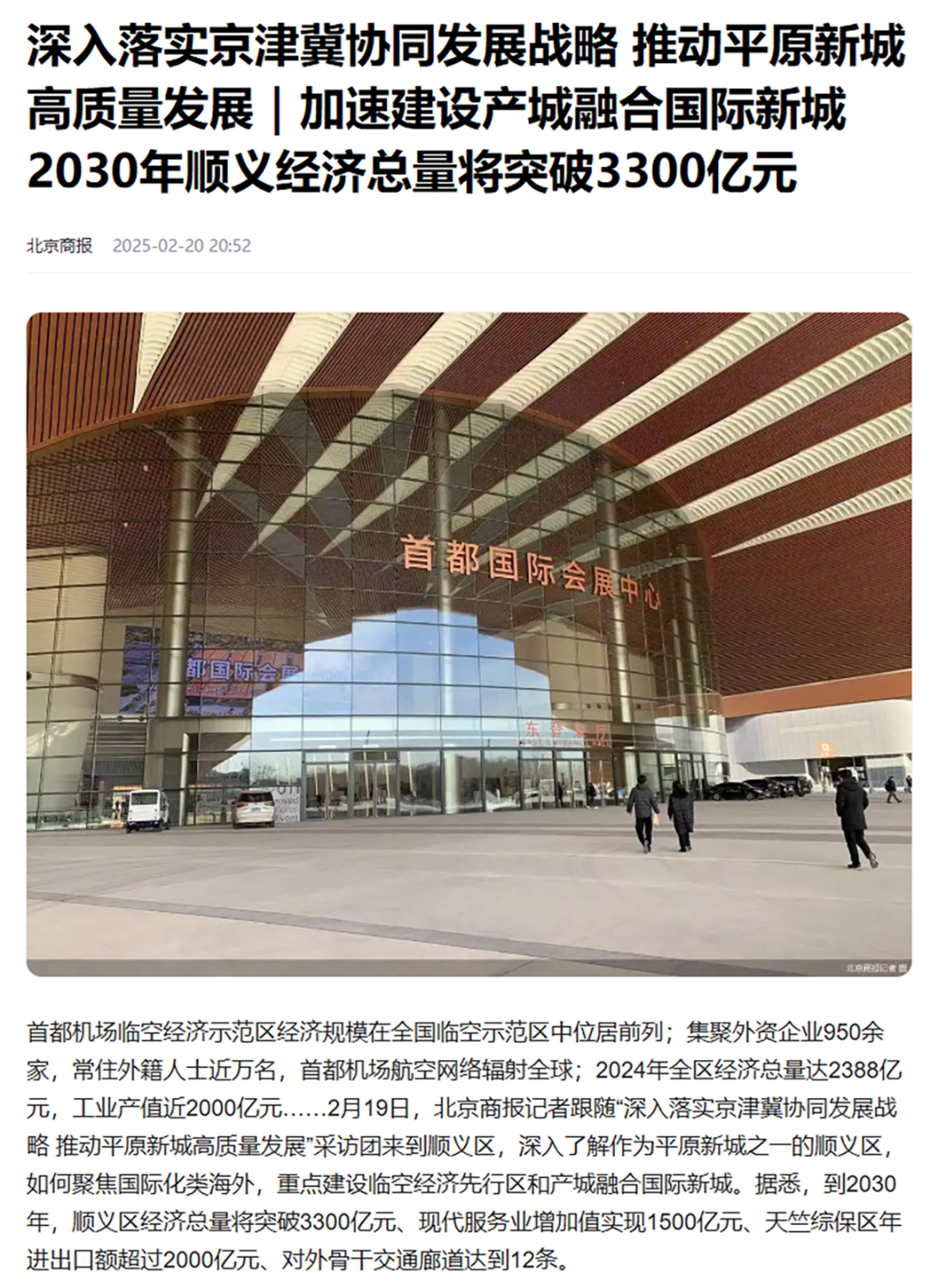 《北京商报》深度剖析,20日刊发了《加速建设产城融合国际新城 2030年顺义经济总量将突破3300亿元》,从会展业新展安排、国际经济技术合作、罕见病药品保障先行区等多个维度,全面展示了顺义会展业、中德产业园、天竺综保区及医药健康产业的强劲发展态势。