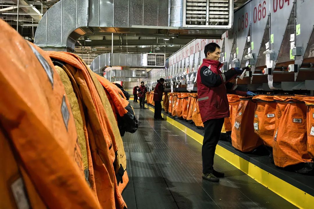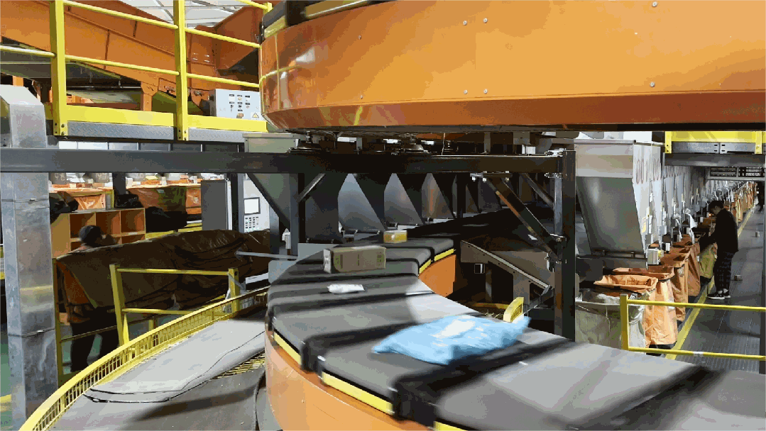 在圆通速递北京转运中心分拣车间,交叉带自动化分拣设备正在运行。工作人员熟练地将快件套袋封装,确保每件包裹都能准确无误地进入分拣通道,现场忙碌而有序。