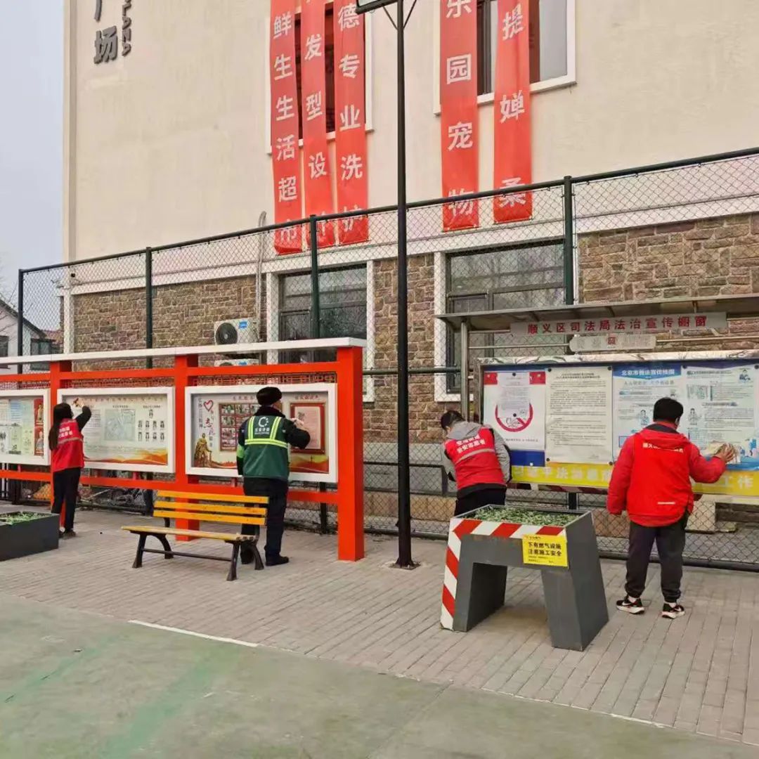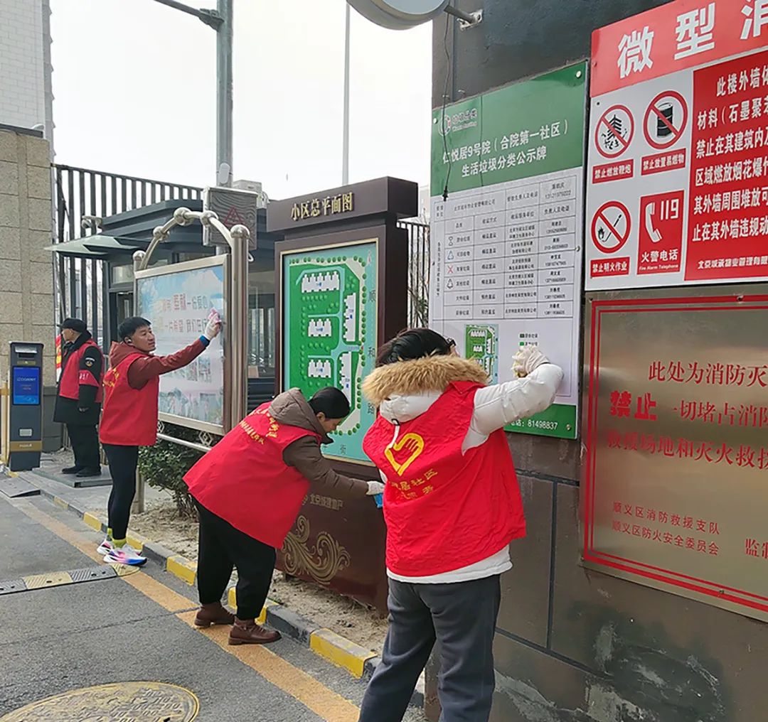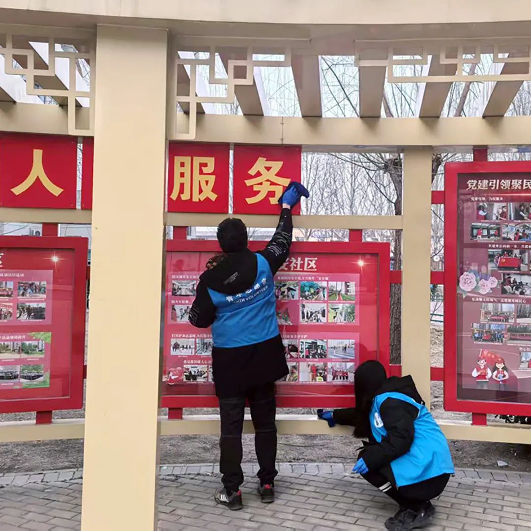 高丽营镇丽喜花园社区党员擦拭宣传栏。