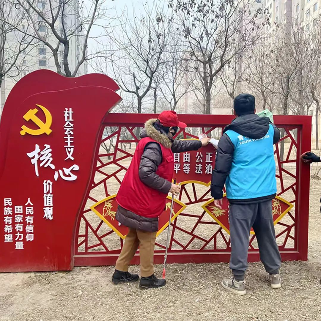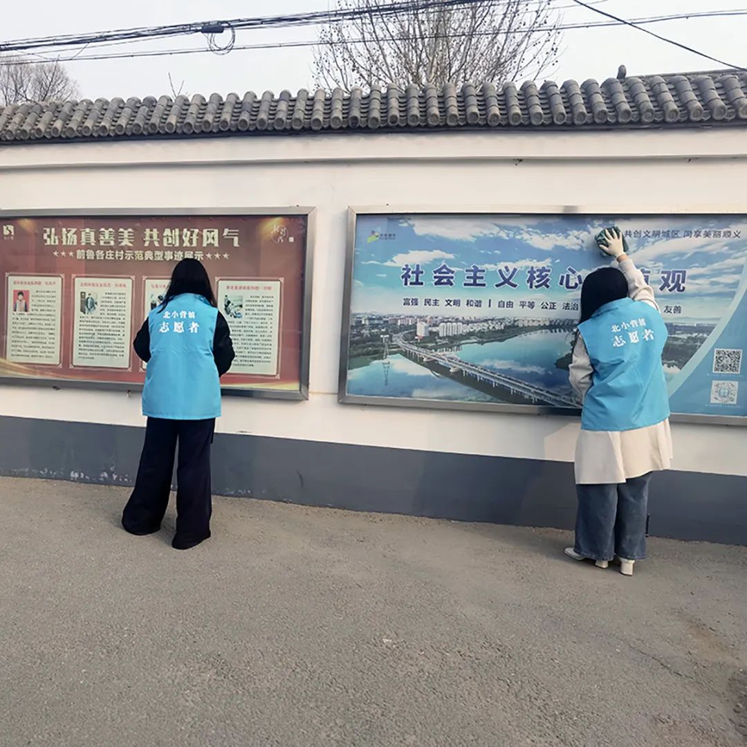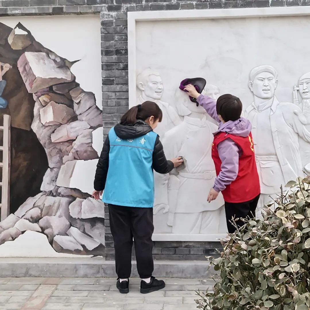 龙湾屯镇志愿者擦拭镇域文化墙。