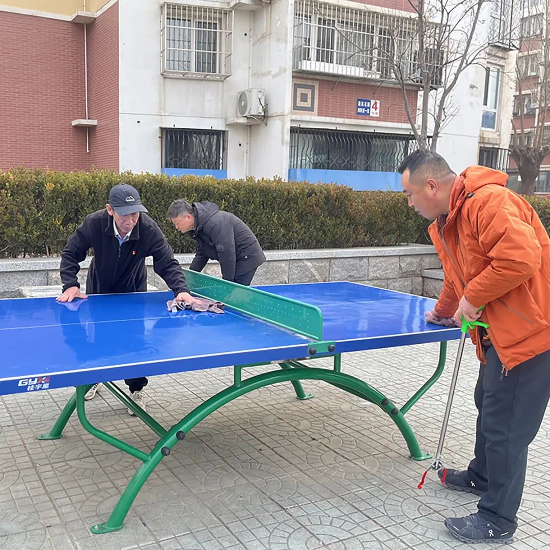 后沙峪镇回民营村党员擦拭乒乓球台。