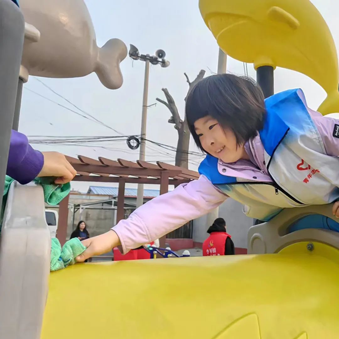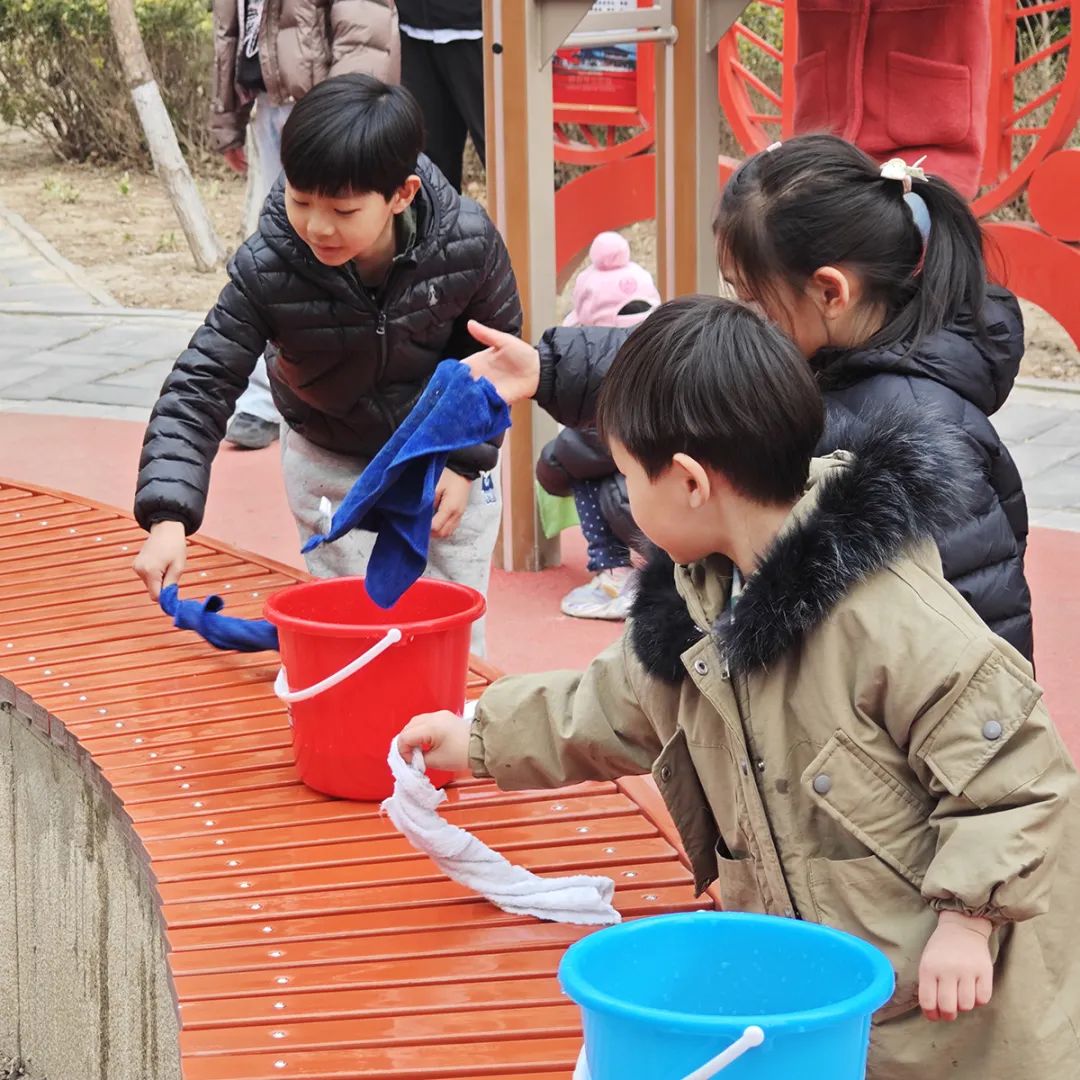 胜利街道红杉童书苑志愿服务团队小朋友擦拭广场座椅。