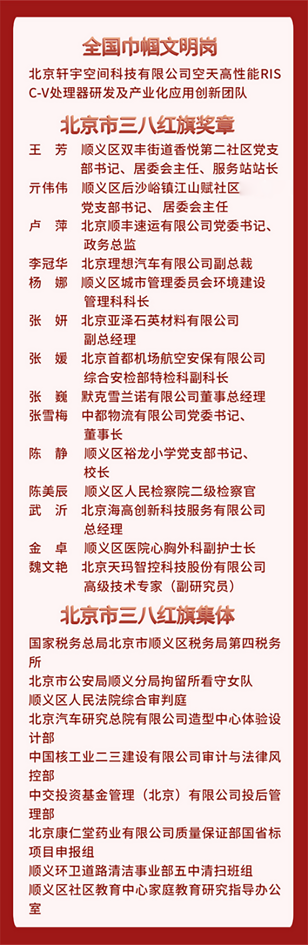 顺义区融媒体中心消息 近日,全国妇联对10名全国三八红旗手标兵、596名全国三八红旗手、395个全国三八红旗集体、599个全国巾帼文明岗进行表彰;北京市妇女联合会、北京市总工会、北京市人力资源和社会保障局授予600人北京市三八红旗奖章称号,授予300个单位北京市三八红旗集体称号。其中,顺义区1个集体荣获全国巾帼文明岗称号,14名个人荣获北京市三八红旗奖章,9个集体荣获北京市三八红旗集体称号,展现了顺义女性昂扬向上的精神风貌!