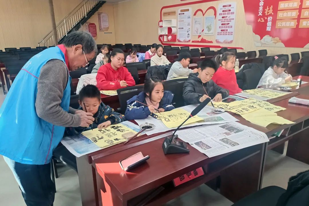 南彩村阳光托管班书法活动现场。