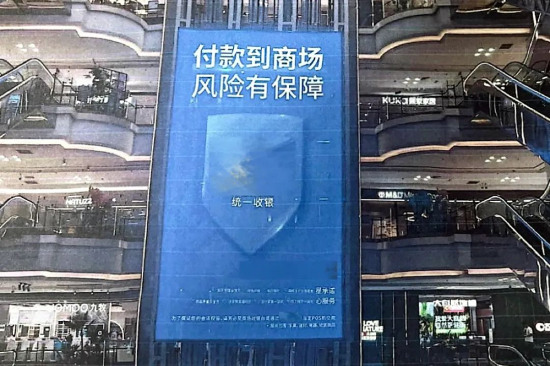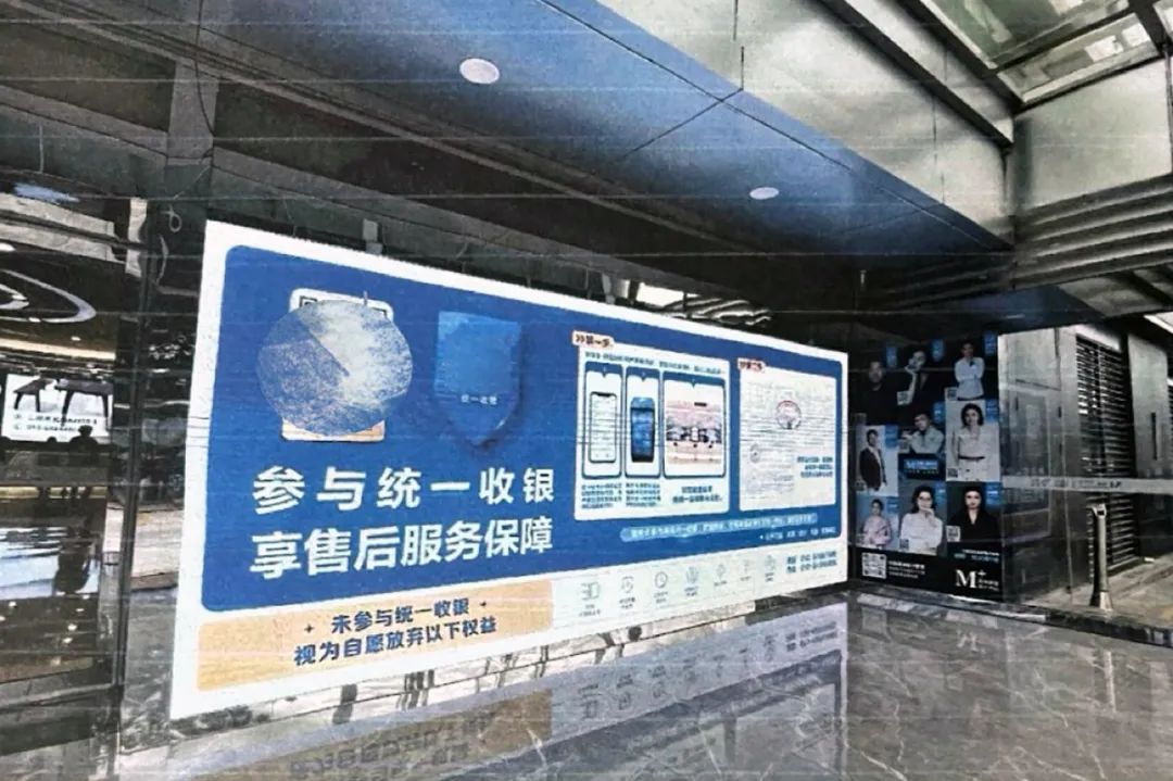 某商场内设置多处醒目标识提醒消费者付款到商场。