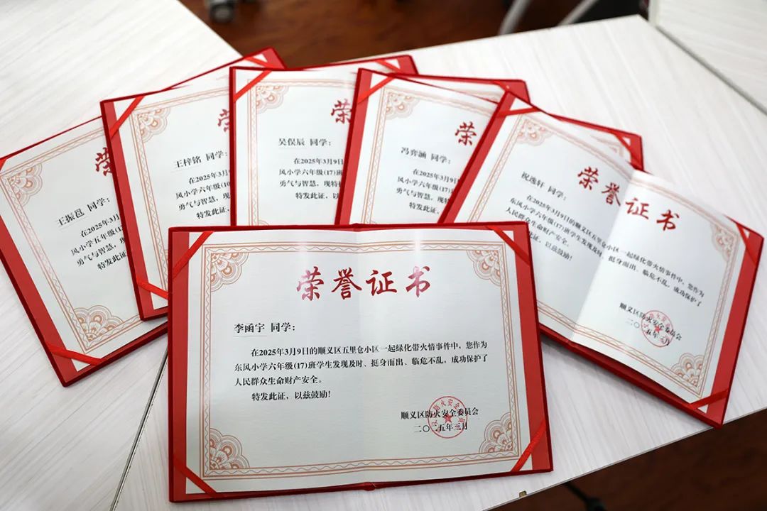 顺义区融媒体中心消息3月18日,顺义区防火安全委员会为东风小学的六名小学生——王梓铭、李函宇、吴俣辰、冯弈涵、祝逸轩、王振邕颁发了荣誉证书,表彰他们协助小区保安人员灭火的勇敢行为。