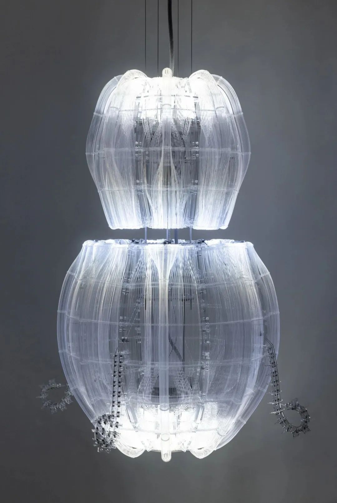 动态雕塑《嵌套之肺》的灵感来源于距今约5亿年前的寒武纪放射虫。它巨大的形体悬浮于空中,体内的光波沿着精心编织的光纤闪烁,显示出其特有的机械构造。几只触手有节奏地卷曲及展开,如同正在 “呼吸”,同时也在提醒着观众,此刻呼吸到的氧气与原始生物在地球上的生命循环息息相关。
