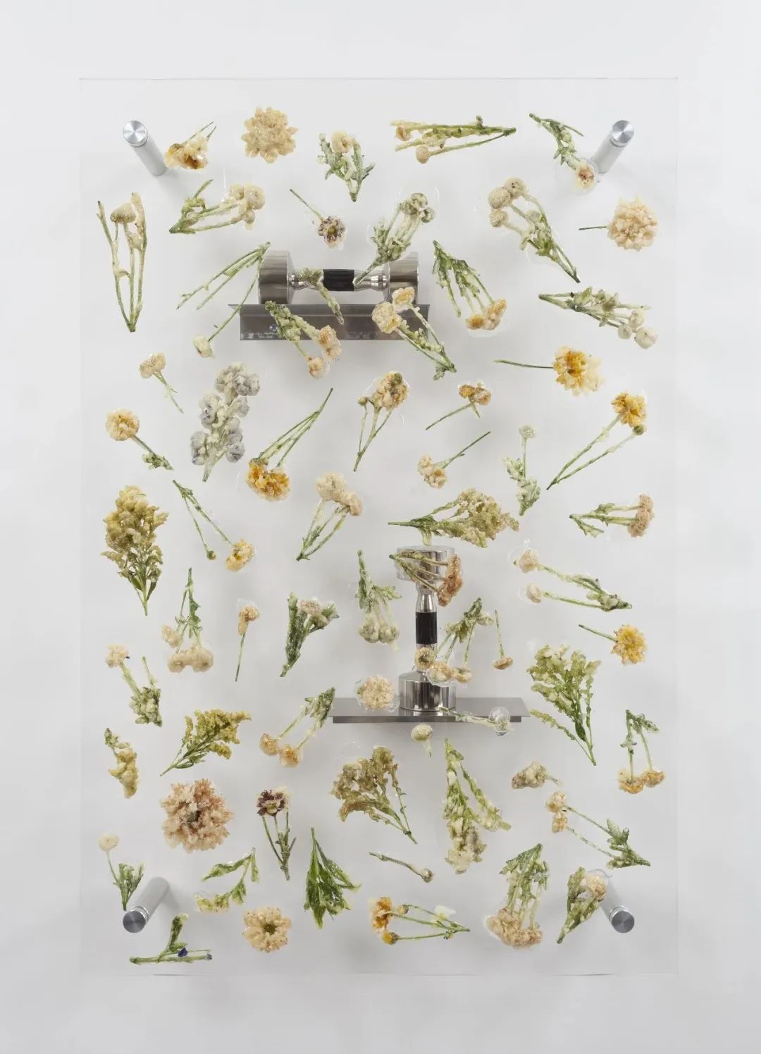在2014年的作品《古典早期IV》中,天妇罗炸花被固定在树脂、有机玻璃和金属哑铃中,使花朵失去了本身的生命力,呈现出近乎暴力的特质。背景中的金属哑铃与易逝的花朵形成鲜明对比,暗示了人们试图塑造身体以抵抗萎缩和体重增加的自然过程。