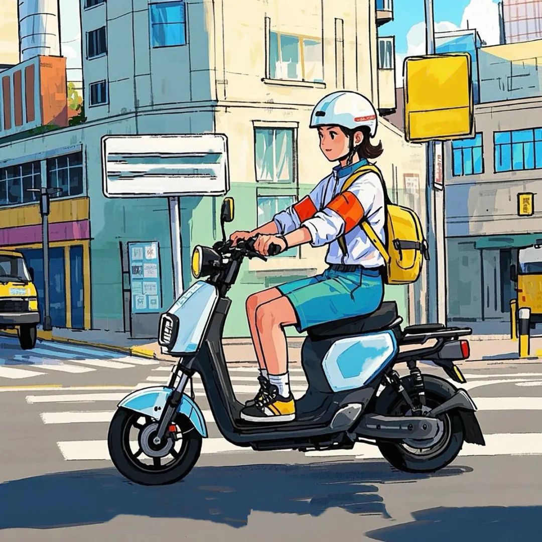 意意选择骑电动自行车出发,正确佩戴了安全头盔,不超速、不闯红灯、不逆行、不抢机动车道。