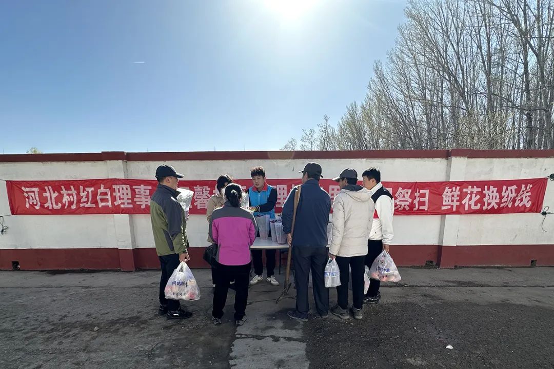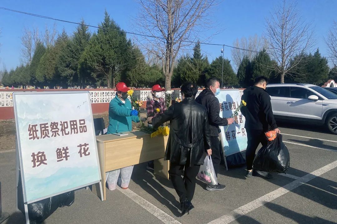 发放文明祭扫宣传单以及鲜花祭祀用品。