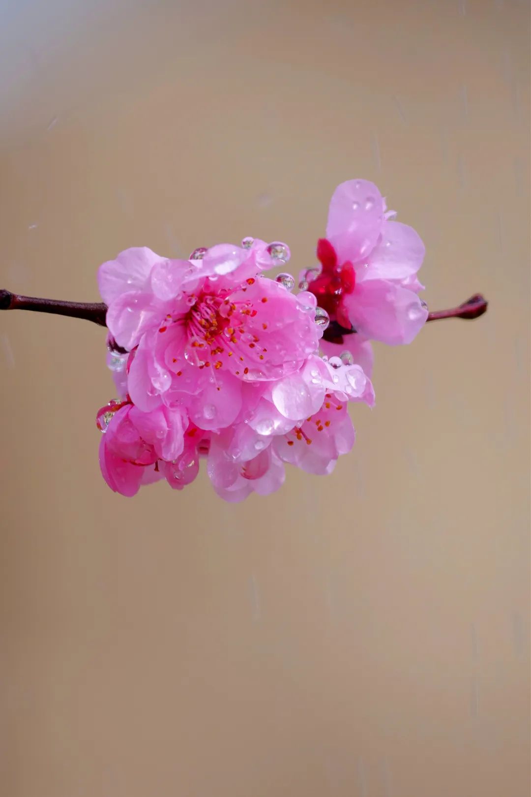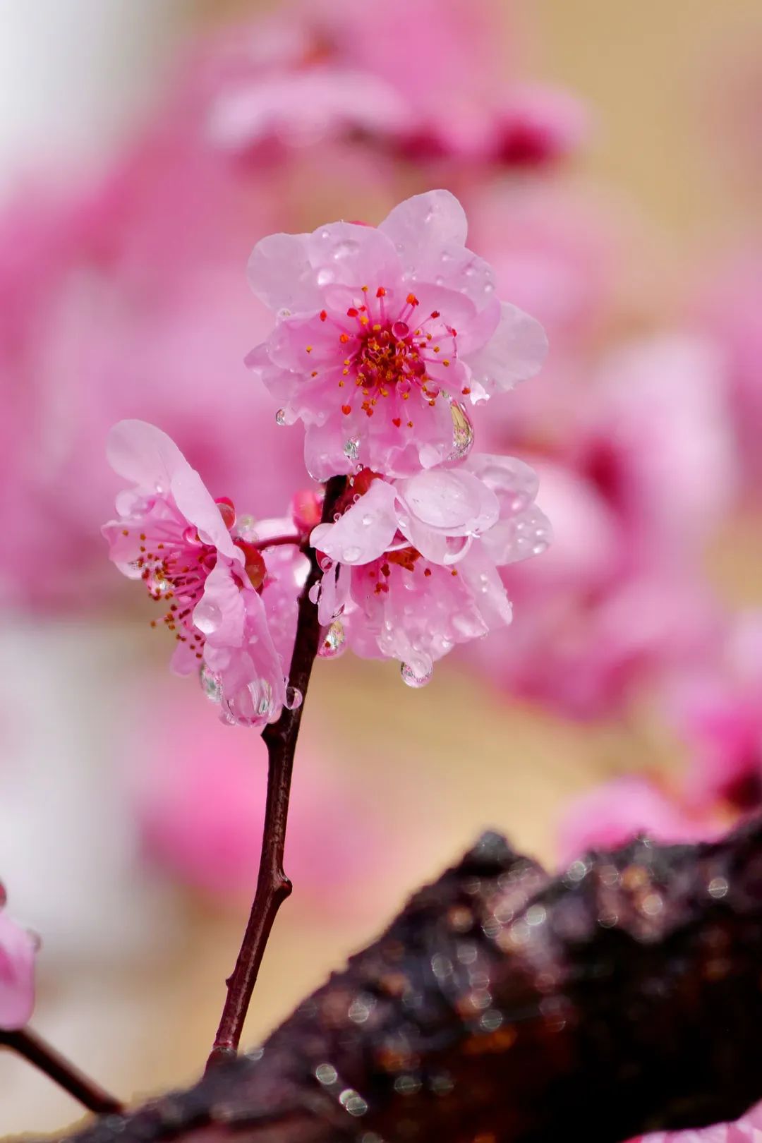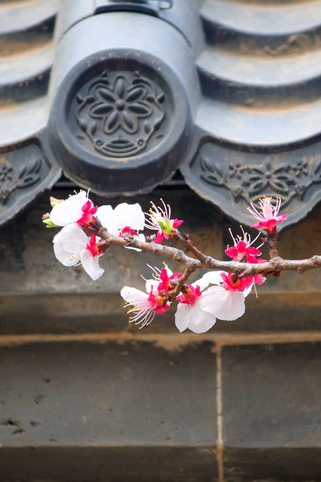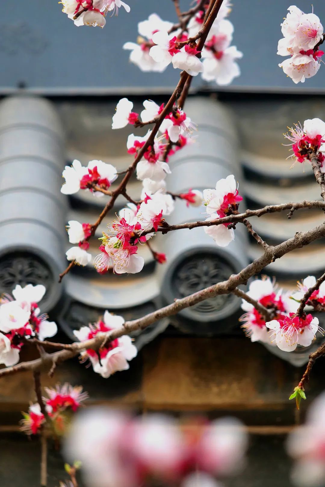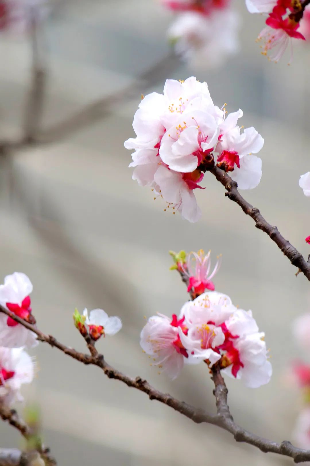 几枝粉嫩的杏花悄然绽放
