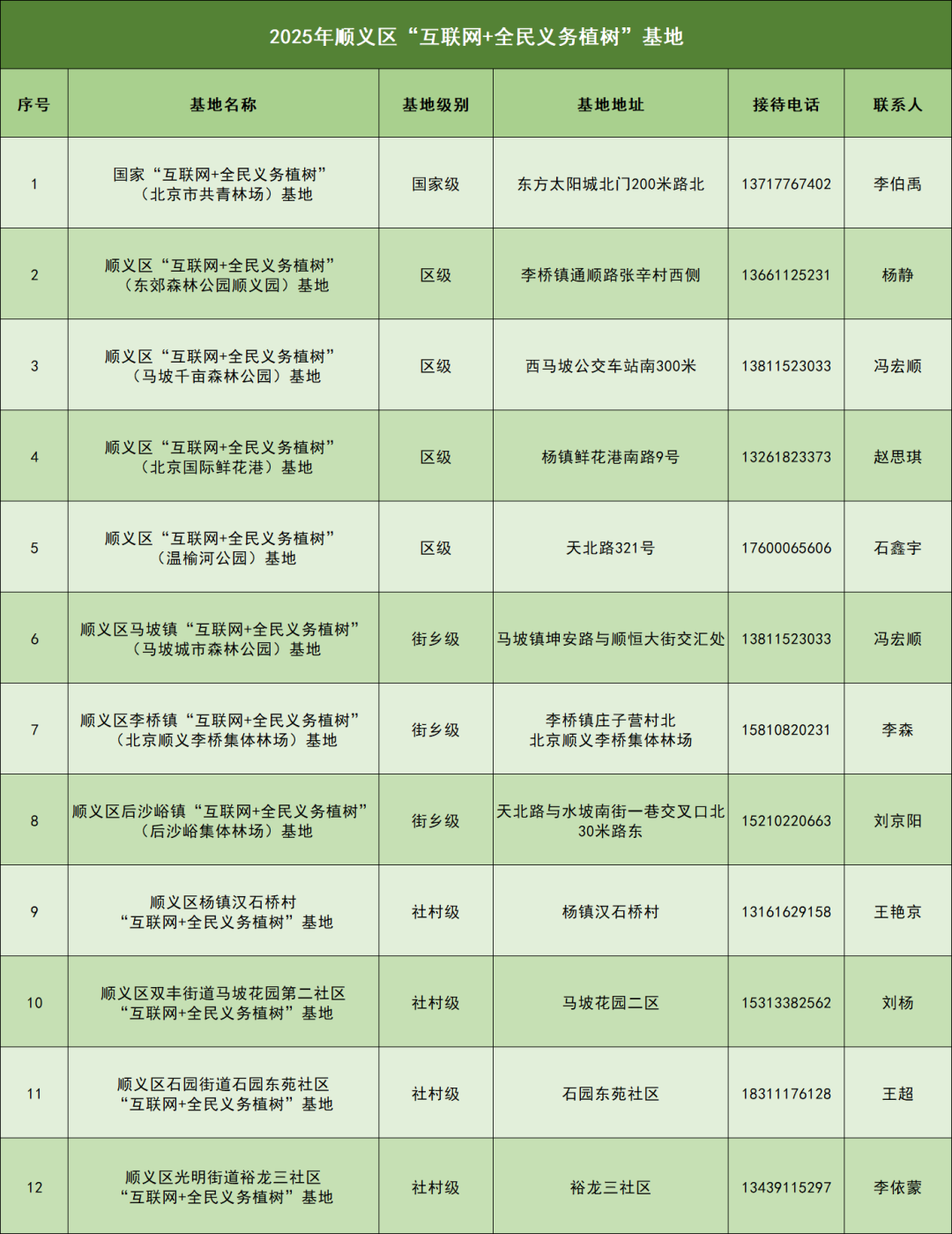 2025年顺义区设立12个“互联网+全民义务植树”基地,提供多种尽责形式的全年接待服务。市民可通过“首都全民义务植树”微信公众号查询感兴趣的义务植树尽责活动,进行预约,参与义务植树。