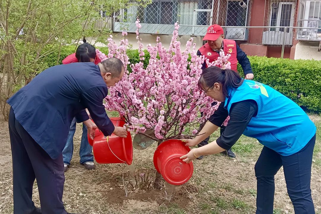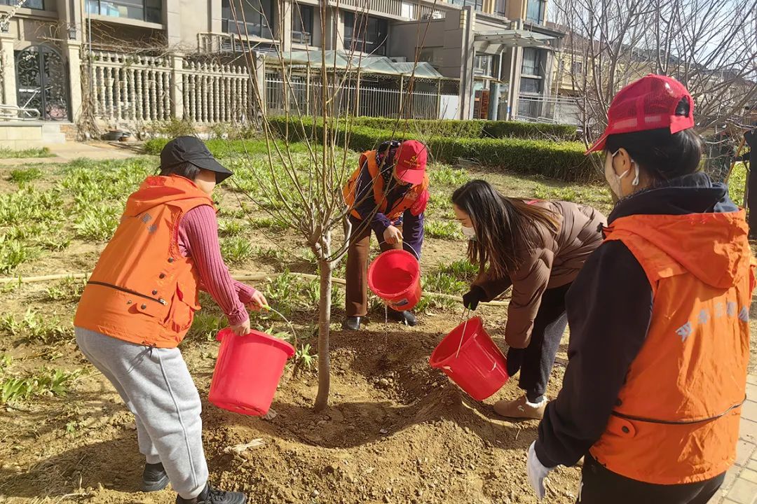石园街道石园西区社区联合共驻共建单位鑫海韵通大卖场石园店开展植树种花志愿服务活动。志愿者们提着水桶,为社区内的花草树木浇水,美化社区绿化环境。