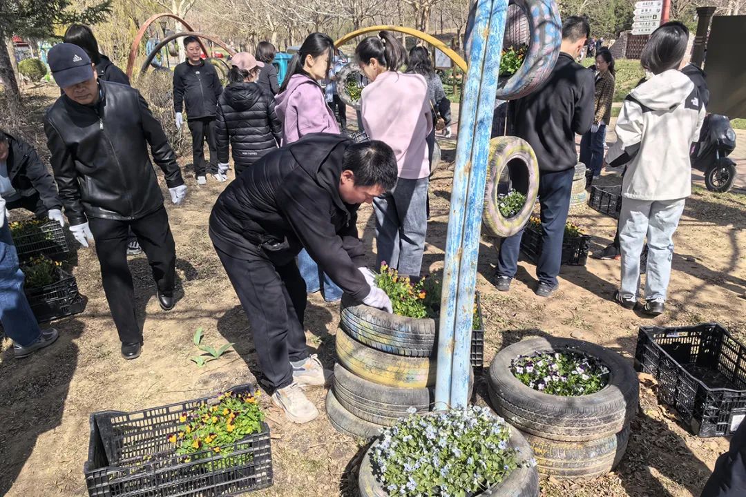 区生态环境局携手北京国际鲜花港组织开展2025年首都义务植树活动。干部职工搬运、种植角堇花苗,为园区增添一抹绿意。