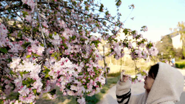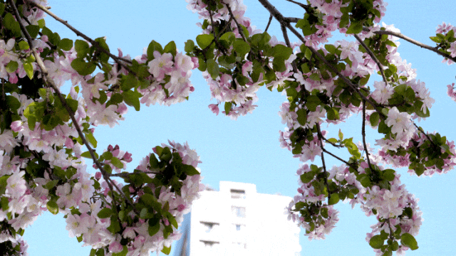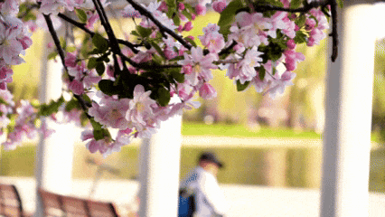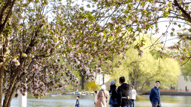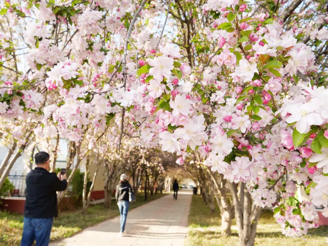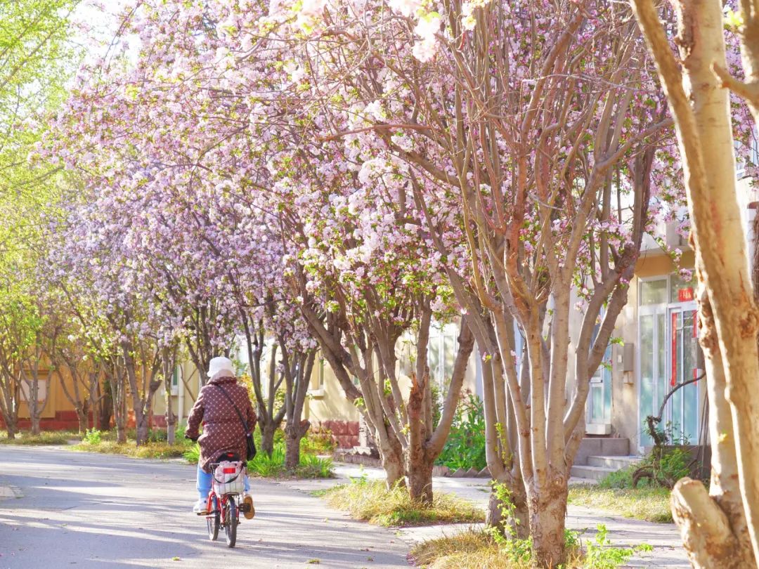 从公园出来,太阳城社区、鼎顺嘉园社区、怡馨家园社区……铺陈在这些居民楼间的海棠大道,是城市美学的生动诠释。推窗见花的长者、骑车穿行的少年、踮脚嗅花香的孩童……春天的美多姿多彩。