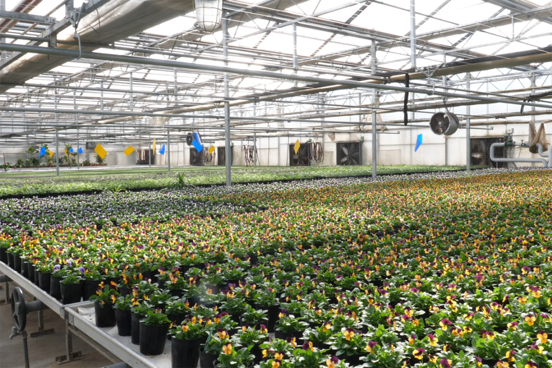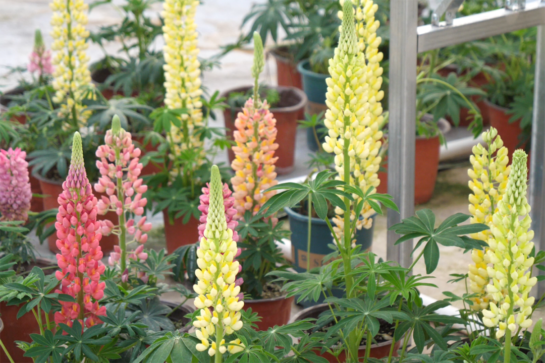 智能温室里暖意融融,角堇、鲁冰花等花卉正茁壮成长。