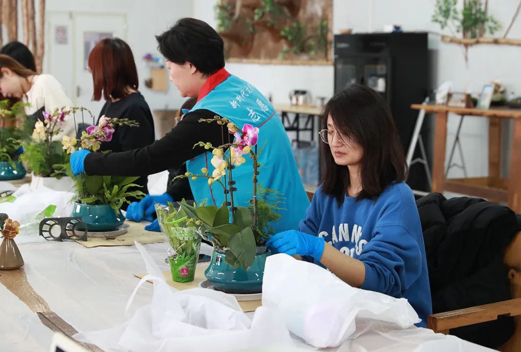 活动现场,花艺老师手持蝴蝶兰盆栽,边讲解边演示。游客围坐在原木长桌前,面前摆放着文竹、蝴蝶兰与古朴陶盆等。在制作盆景的过程中,大家的指尖在花叶间轻盈穿梭。每逢周末与节假日,这里便成了体验“指尖艺术”的宝地。