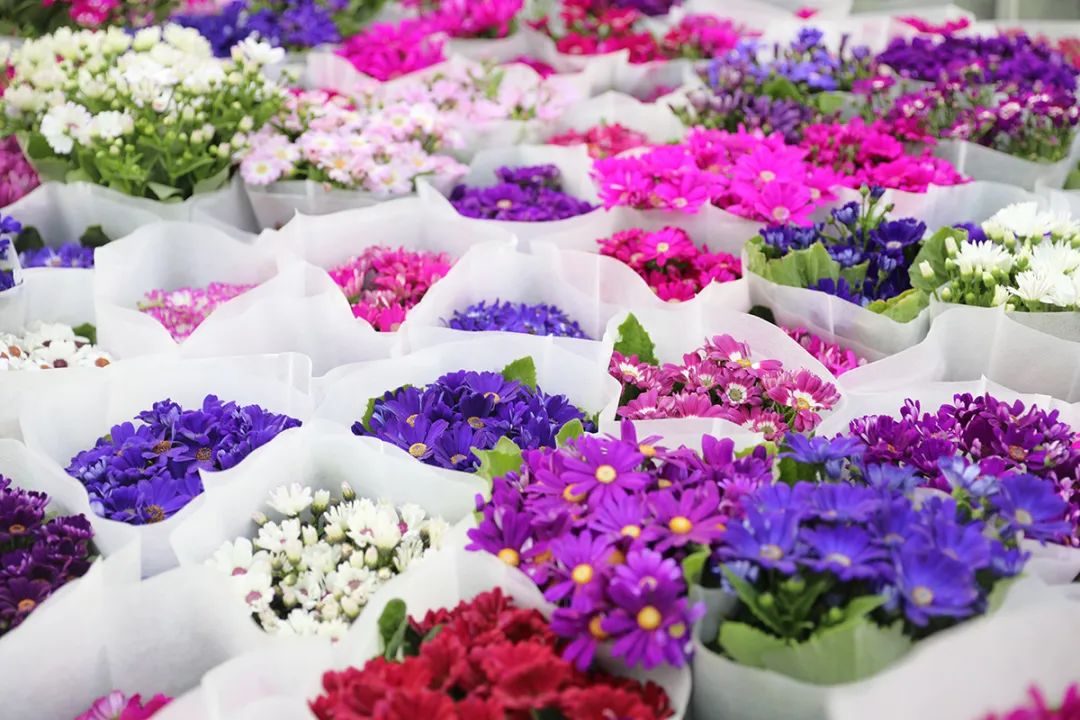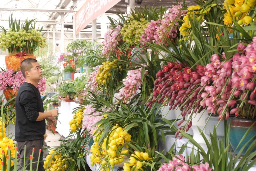 阳光斜照,总占地25000平方米的绿植花卉集散分拨中心人流如织,摊位上摆满了鲜花,芬芳四溢。市民穿梭其中,挑选着心仪的花卉。