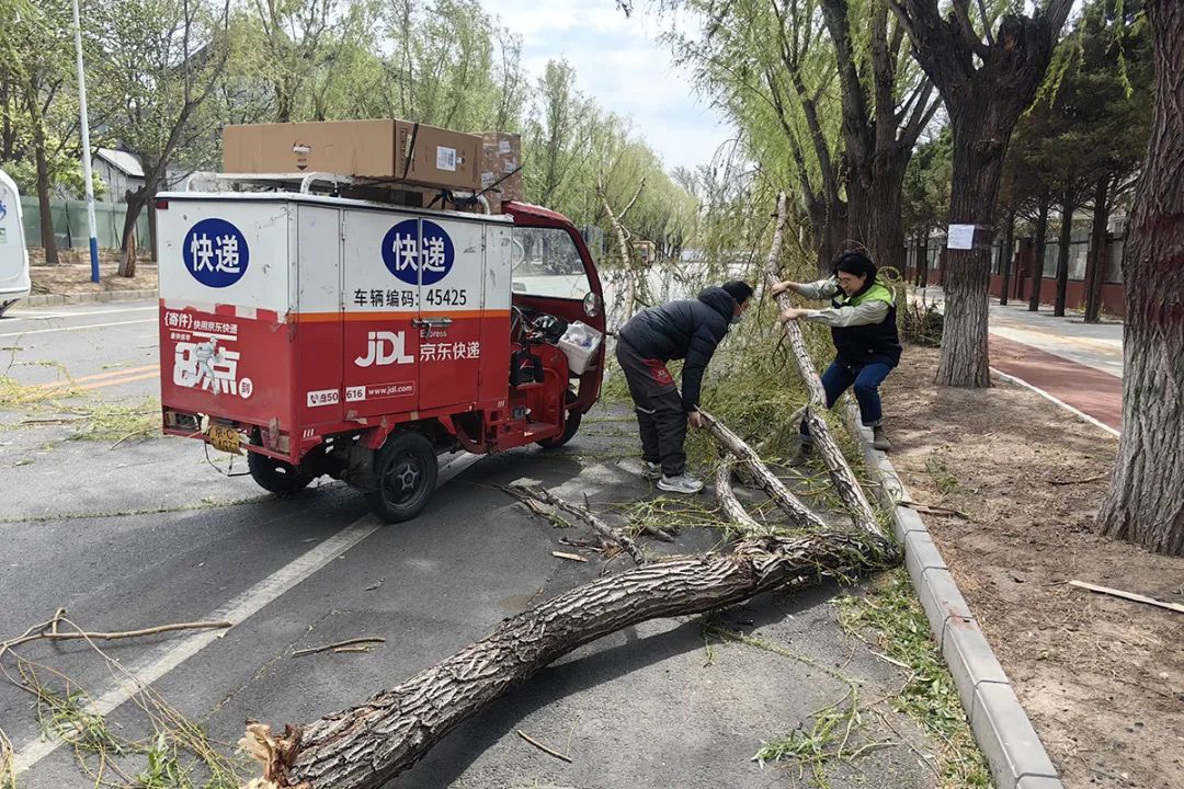 4月12日中午,空港街道优山美地社区网格员欧颖巡查到馨园五路时发现,断裂的柳树枝挡住半幅路。她试图挪动树枝,但树枝始终纹丝不动,就在这时,转角处突然传来电动车的急刹声。“姐,我来帮您!”京东快递员刘朋祥从车上跳下来,原来他正冒风派送快递,远远看见有人在路中间吃力挪动树枝,便毫不犹豫地停了车。