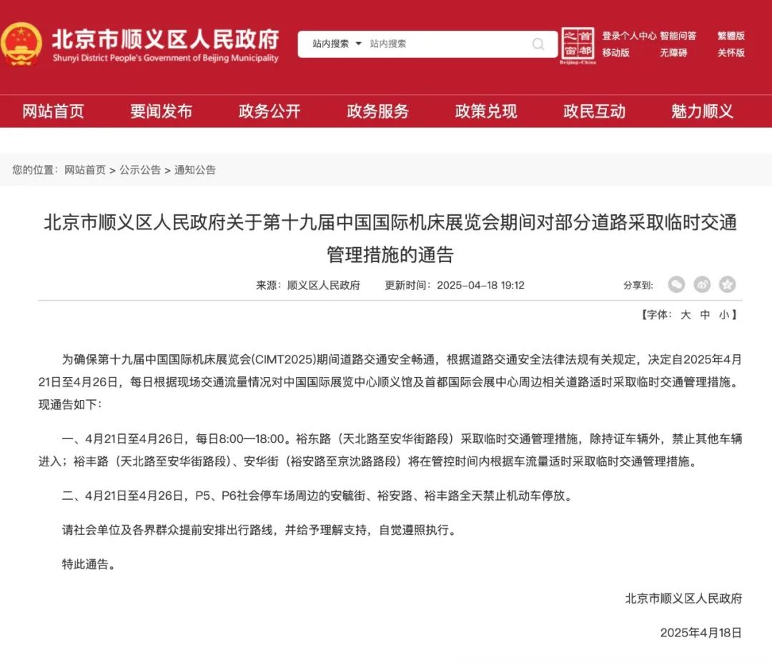 顺义区融媒体中心消息第十九届中国国际机床展览会将于4月21日至26日在首都国际会展中心和中国国际展览中心(顺义馆)举行,预计展会期间顺义区新国展区域及沿线整体交通流量将保持高位运行,重点区域道路拥堵风险较高,部分路段将采取临时交通管理措施。
