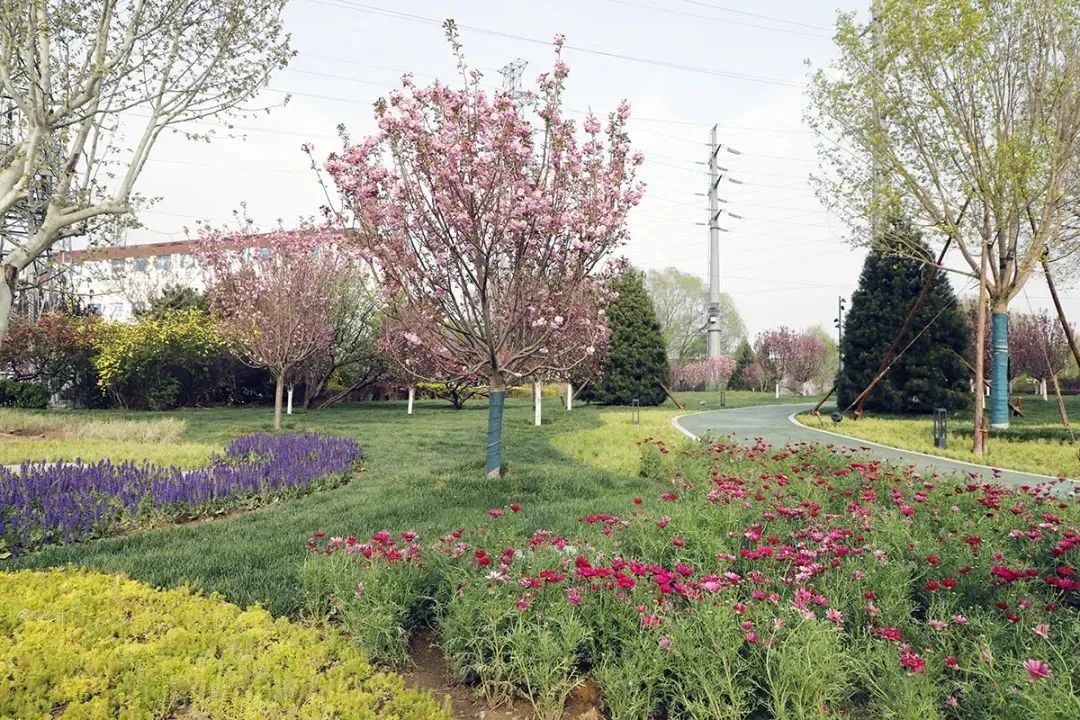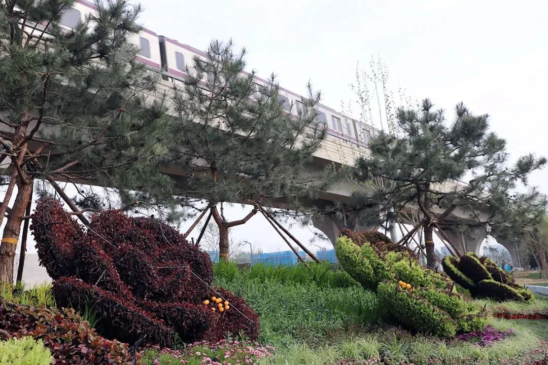 天北路与裕丰路交会口临近展馆,顺义区因地制宜在这里打造了一处占地面积5200平方米的景观节点。绽放的海棠掩映着不远处的展馆,林荫鼠尾草、绣线菊等多种乔灌草植物营造了小而美、层次丰富的街边景观。