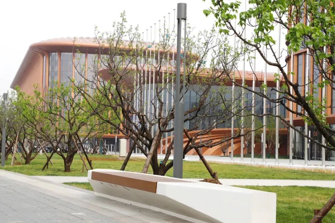 首都国际会展中心以“紫金丝带”为灵感创意,顺义区据此延伸出裕东路绿地“紫气东来”的设计主题,并沿裕东路为会展工作人员、参展观众及周边市民打造了休闲放松的空间。记者在展馆东侧的裕东路绿地内看到,这里绿树环抱,景观小品错落点缀,休闲长椅、景观照明等配套设施一应俱全。