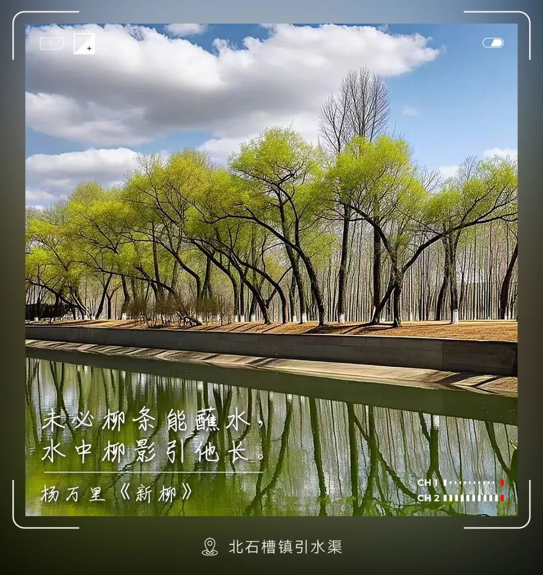 “碧水悠悠绕柳堤,春风拂面满襟衣。”