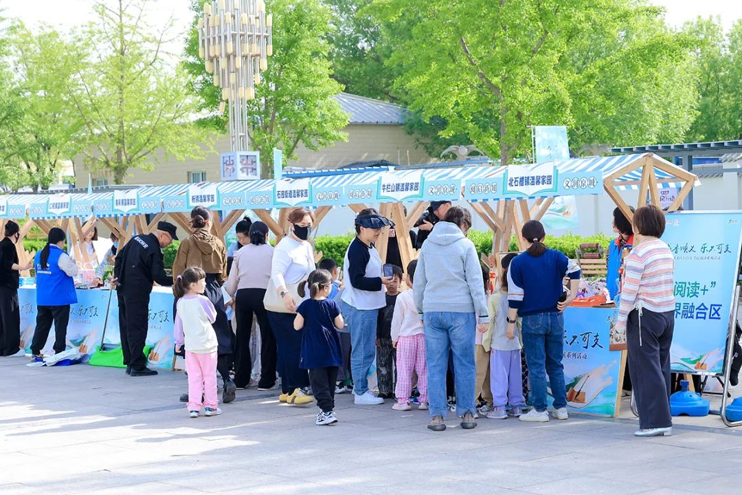 书香市集热闹非凡,知了花间书吧、着迷星球等6家实体书店携手北京重力聿画影视文化有限公司开展主题书展、文创展销等活动,吸引市民参与。