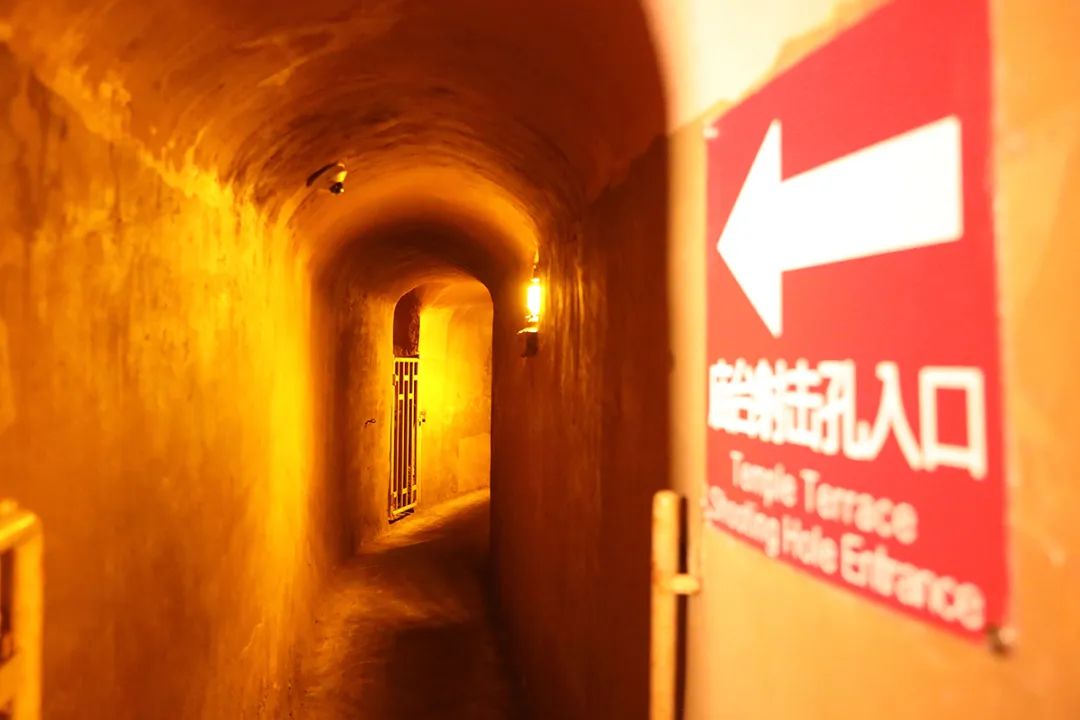目前真实地道开放830米,每20分钟发送一批游客。为还原地道“藏于无形”的隐蔽性,入口特别设计成与墙体颜色一致的暗门。走进地道,幽深通道中,陷阱、迷宫似的“棋盘路”、锅台出入口、水井出入口等一一呈现在眼前。