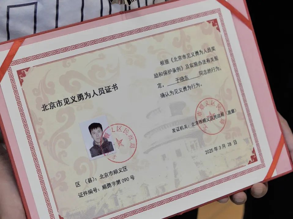 仪式上,区民政局相关负责人为于晓东、殷欢、李梦坤颁发《北京市见义勇为人员证书》,并为其佩戴奖章,对他们在关键时刻奋勇救人、维护正义的义举表示肯定。
