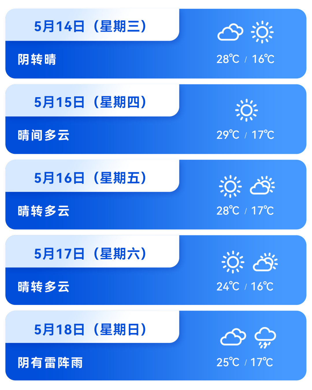 据气象部门研判,今天傍晚至夜间,多云转阴有雷阵雨,南转北风3级左右,阵风8级左右转6、7级,最低气温19℃;明天白天阴转晴,北转南风3级左右(阵风6、7级)转2级,最高气温28℃。今天傍晚到夜间有雷阵雨天气,外出注意防雨防雷。