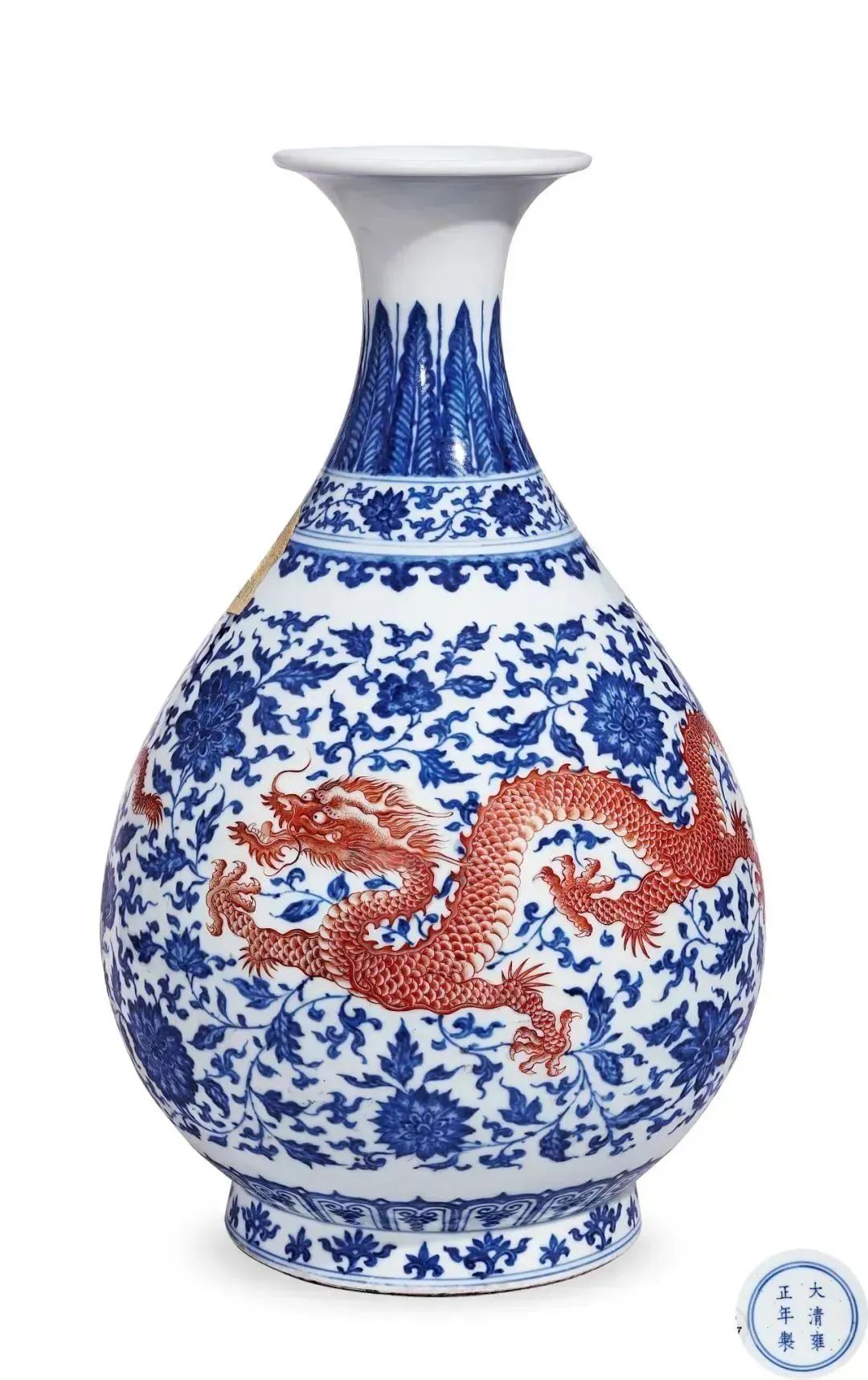 清雍正 青花釉里红加红彩云龙穿花纹玉壶春