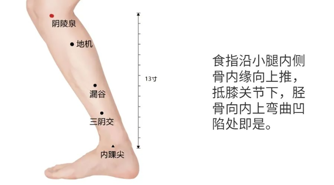 【阴陵泉】阴陵泉,属“足太阴脾经”,有健脾利湿的作用,为人体的“祛湿第一穴”。位置在小腿内侧,当胫骨内侧髁后下方凹陷处。主治腹胀、腹泻、水肿、黄疸、小便不利、遗尿等脾不运化水湿病证。