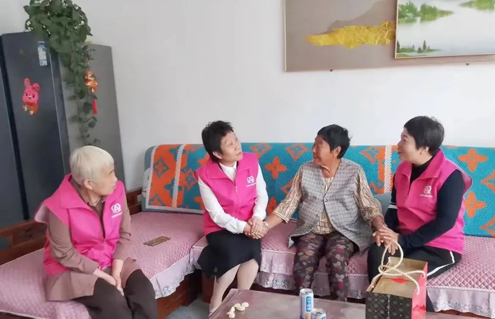 立新(左二)和“巾帼志愿服务队”队员上门陪老人唠家常。