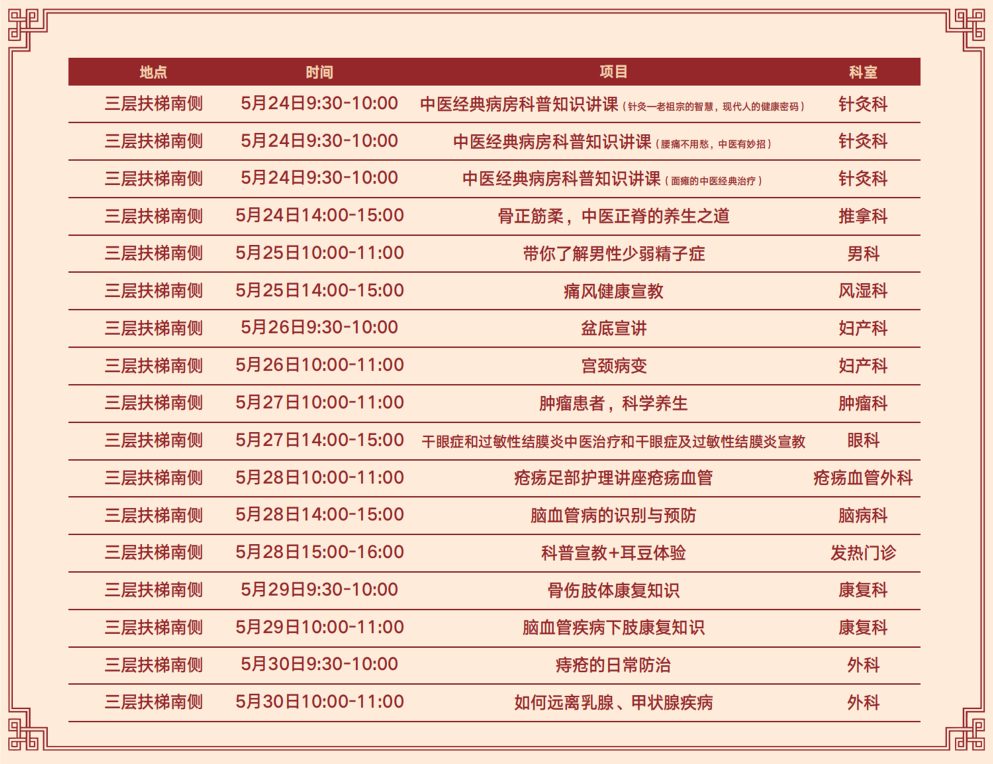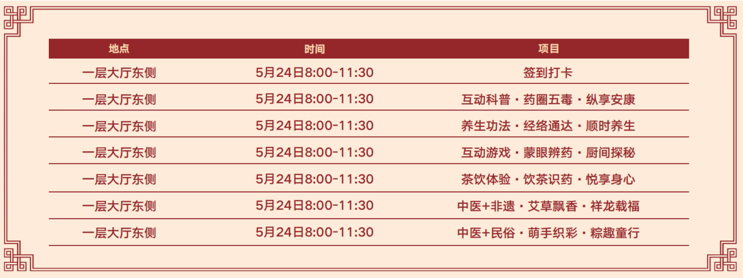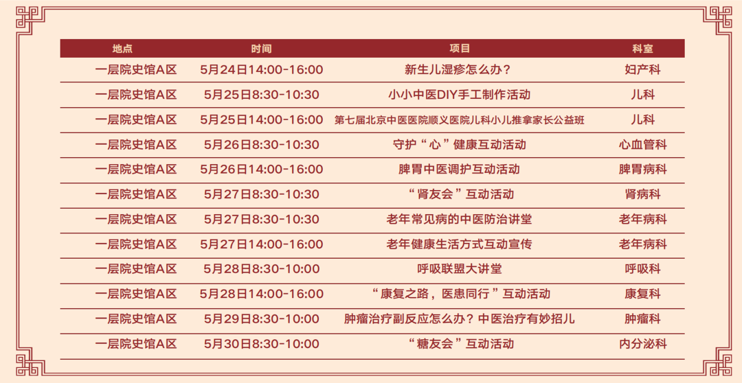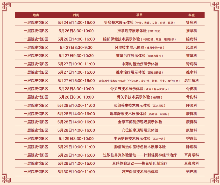 活动期间将举办“糖友会”、“小儿推拿家长公益班”、小小中医DIY手工制作活动、“肾友会”、“呼吸联盟”、“康复之路,医患同行”、“守护‘心’健康”、脾胃中医调护活动、“小儿湿疹怎么办”等内容多样的公益互动活动。还能现场体验经络竹罐、养生艾灸、全息耳部刮痧、蜂针疗法、调脊术按摩、清宫正骨、肿瘤防治、过敏性鼻炎及耳鸣治疗等多种中医特色诊疗技术,用传承千百年中医药文化、技术让您体验健康延年之道。