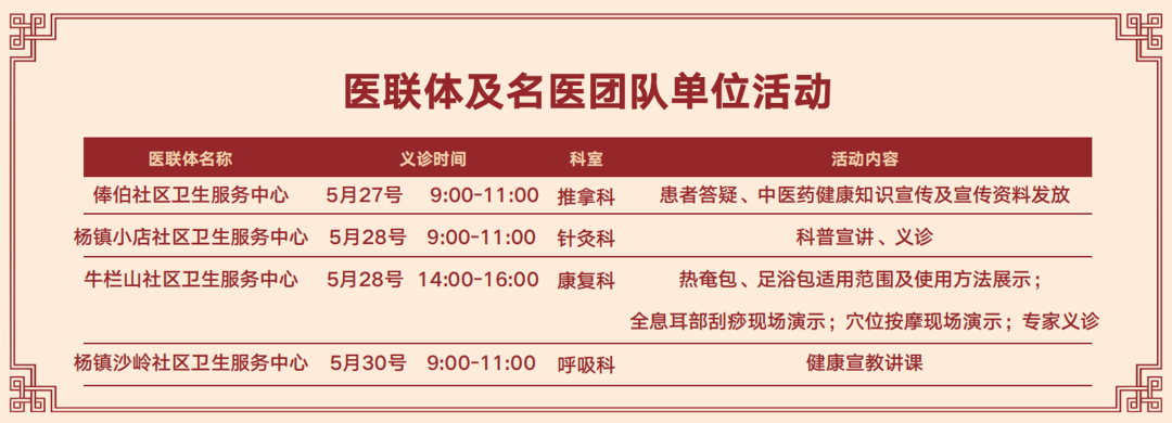 同时,为扩大本次文化周服务范围,普及中医药养生文化知识,将在鲁能美丽汇广场、张镇--浅山香邑小区广场、旺泉--宏城花园广场、牛栏山社区卫生服务中心、赵全营--忻州营村委会联合开展中医互动活动,现场体验免费义诊、健康咨询、八段锦教习、测血压、测血糖等活动。
