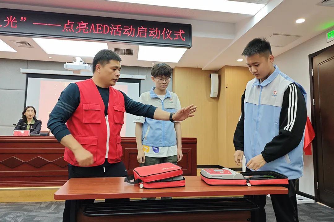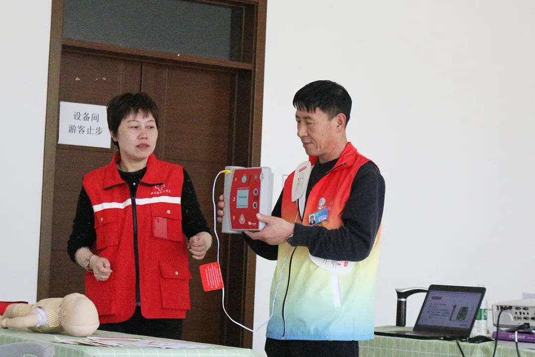 区红十字会急救老师为志愿者介绍AED使用方法。