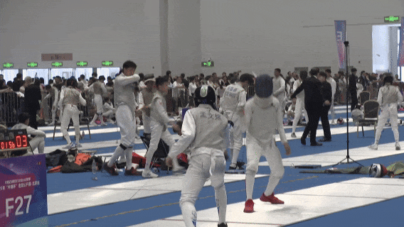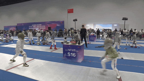 首日比赛包含U10组和U16组两个年龄段。U10组的小将身着击剑服,在剑道上你来我往,进攻、防守、反击,每一个动作都充满了力量与技巧。U16组赛区剑风呼啸,少年们步伐迅疾如电,剑尖在电光石火间精准交锋,胜负常在瞬间决出。双方在剑道上沉稳移动,攻防转换间尽显经验与力量的博弈。