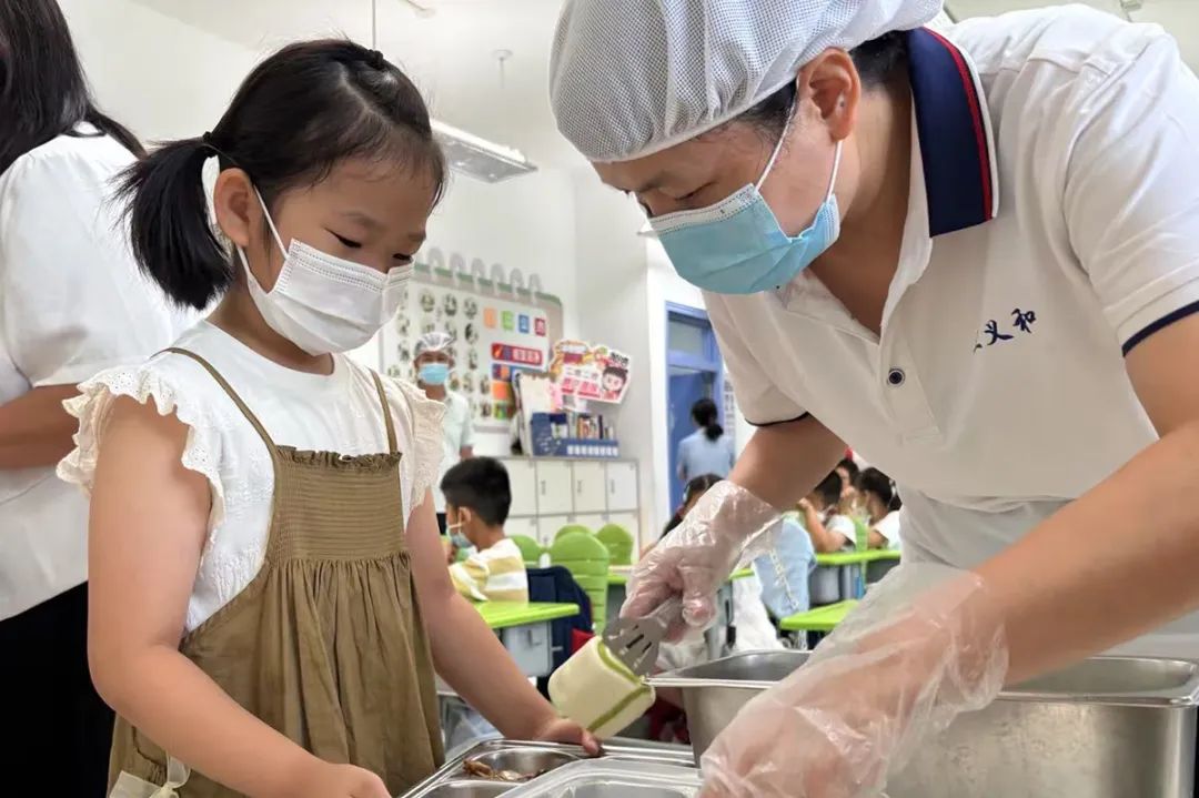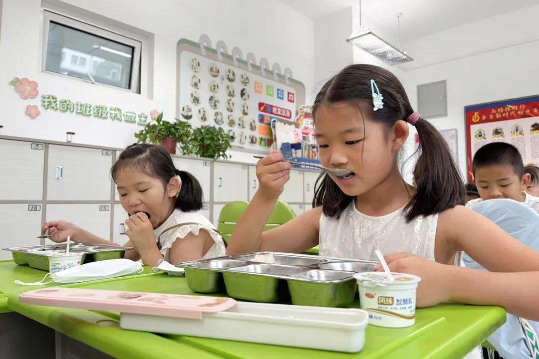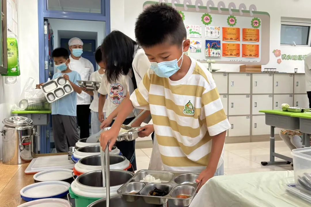 该校托管服务面向小学一至五年级学生,每天有2名教师负责看护,组织孩子们自主学习、阅读、锻炼等。午餐时间,学生们有序排队打饭,享用营养均衡的午餐。