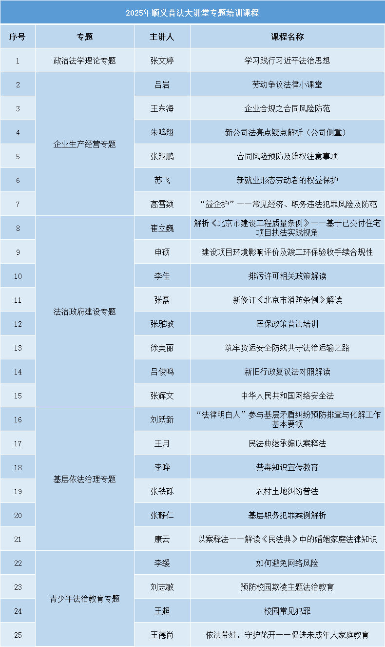 顺义区融媒体中心消息 5个专题,25个课时,辐射全区,区司法局精心策划2025年顺义普法大讲堂,以创新的模式、专业的内容、精准的定位、多元化的服务推动法治顺义建设,提升公民法治素养、营造良好的法治环境。