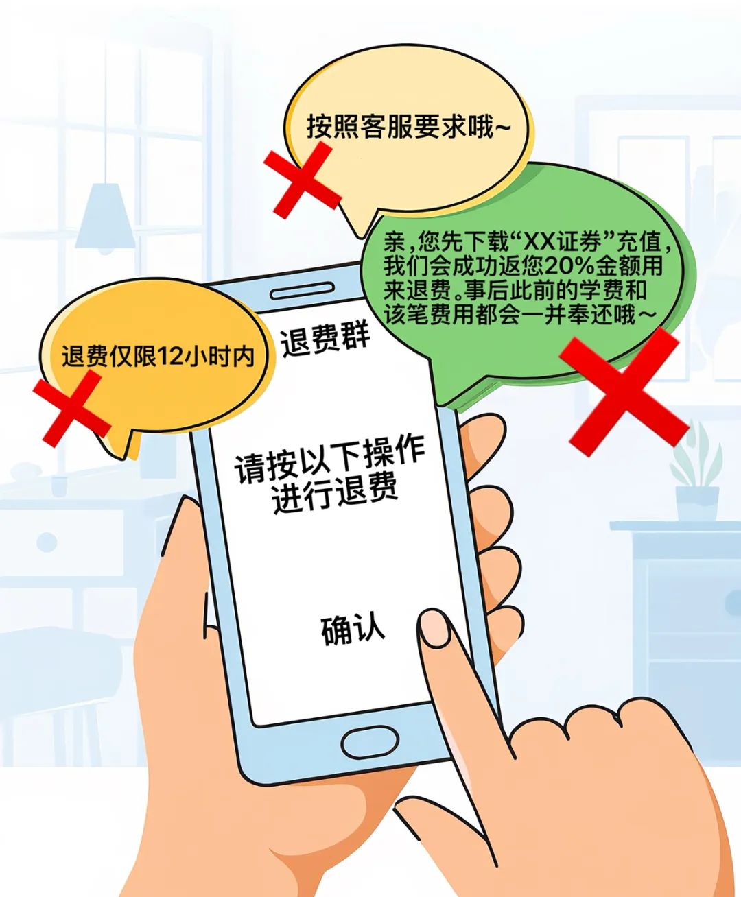 暑期同样是“培训退费骗局”的高发期。不法分子通常会伪造退费通知,通过快递信函、短信、社交软件私信等方式发送给家长或学生,谎称可以快速退还学费、资料费。等事主添加“客服”后,会被一步步引导在虚假平台填写信息、转账汇款,掉入精心设计的陷阱。