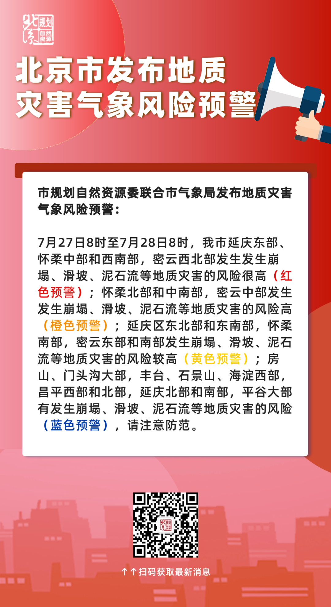 ;怀柔北部,密云中部发生崩塌、滑坡、泥石流等地质灾害风险高(橙色预警);延庆东北部和东南部,怀柔南部,密云东南部发生崩塌、滑坡、泥石流等地质灾害风险较高(黄色预警);房山、门头沟大部,丰台、石景山、海淀西部,昌平西部和北部,延庆北部和南部,平谷大部有发生崩塌、滑坡、泥石流等地质灾害风险(蓝色预警),请注意防范。