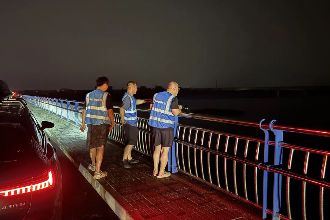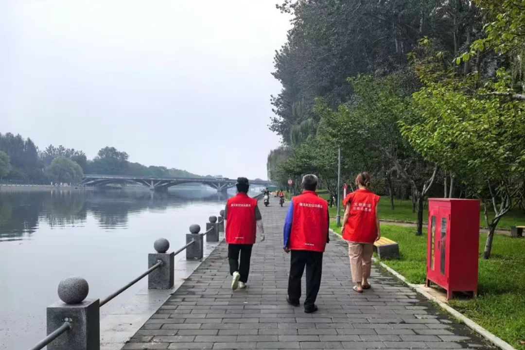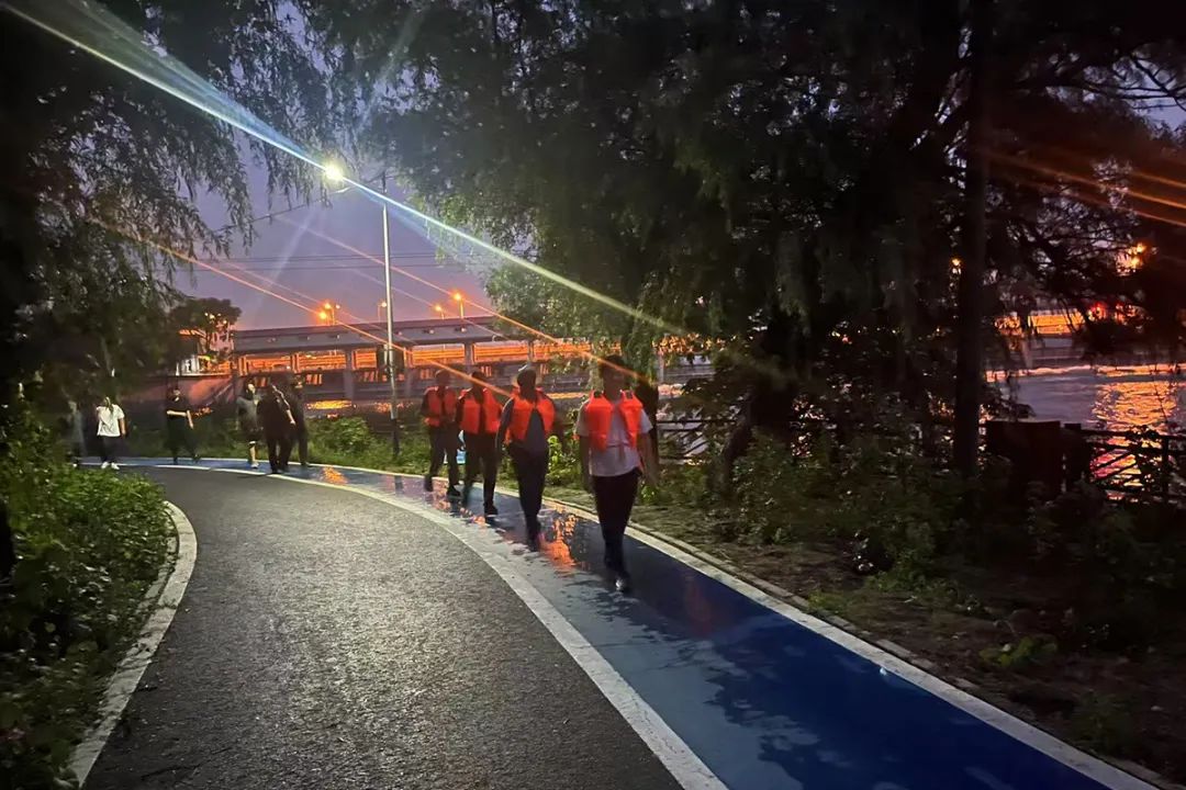 北小营镇小胡营村工作人员在潮白河沿岸开展巡堤查险工作。