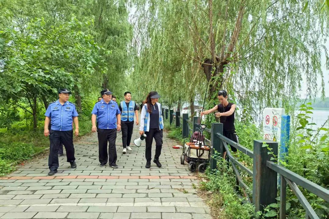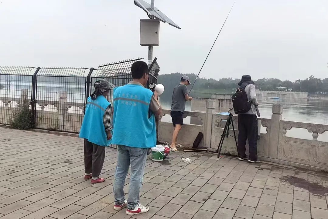 牛栏山镇工作人员对钓鱼人员进行劝离。