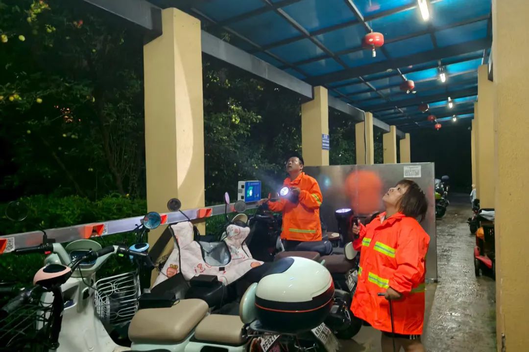 光明街道各社区工作人员巡查小区安全隐患,清理积水点,确保居民出行安全。