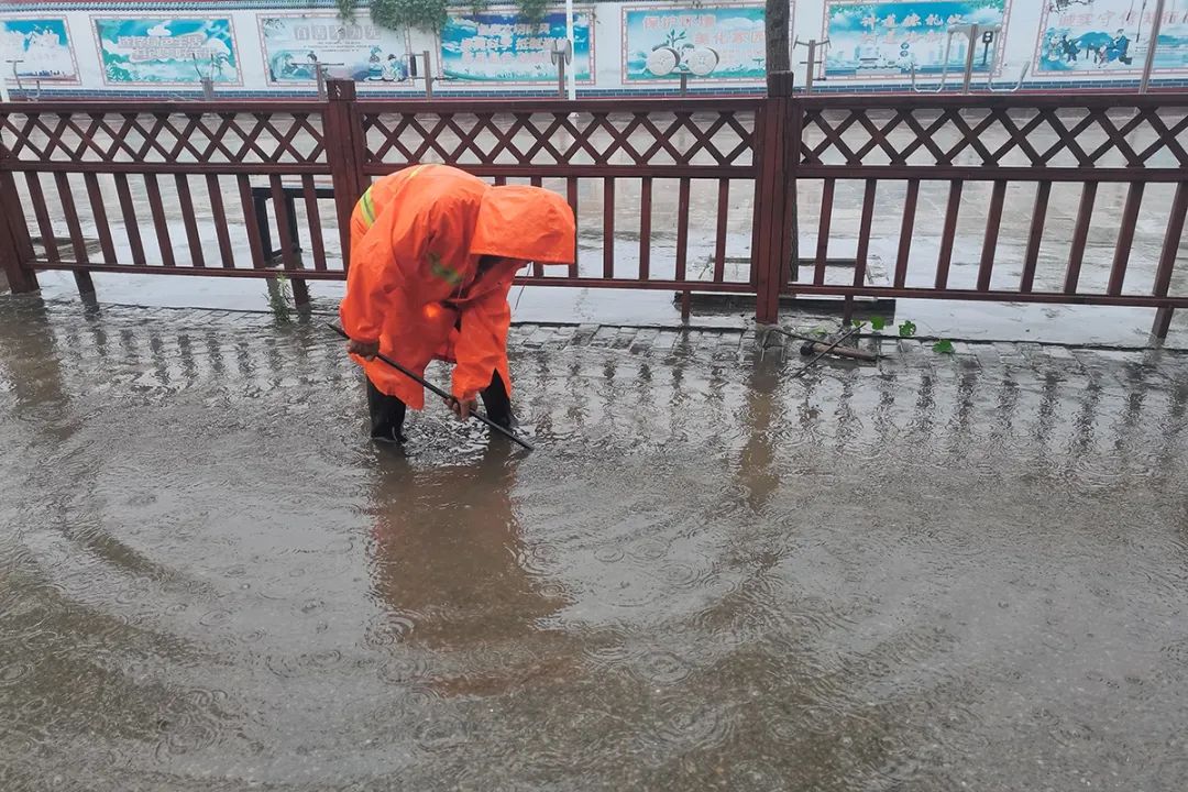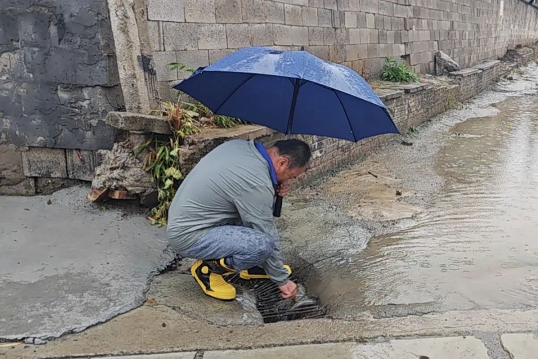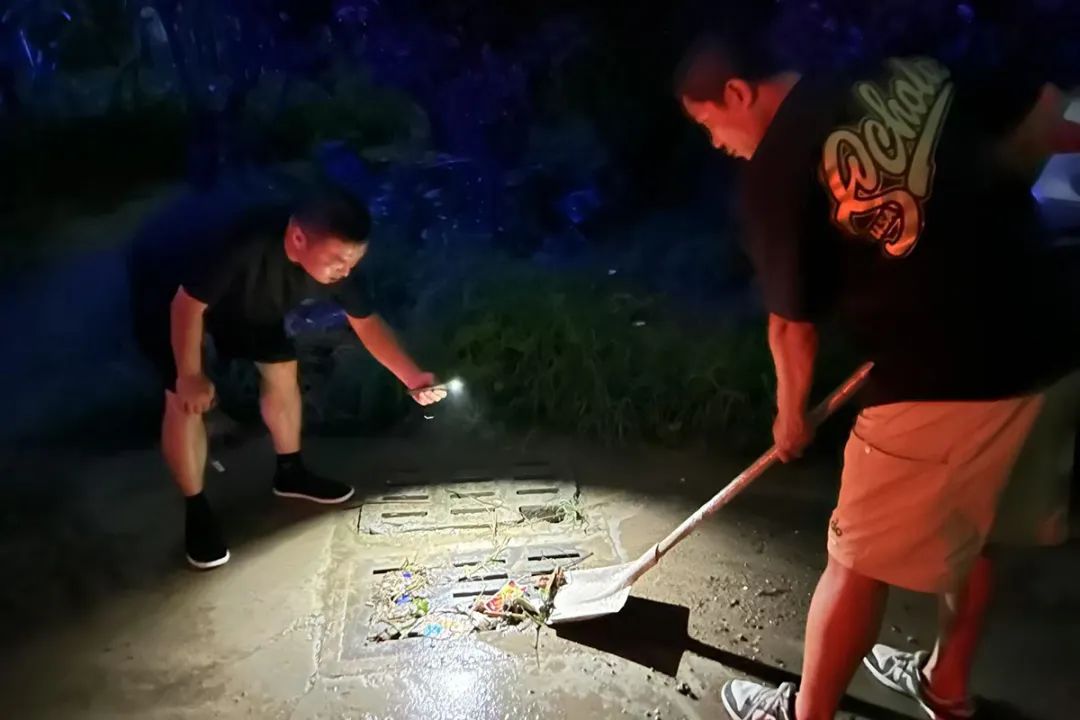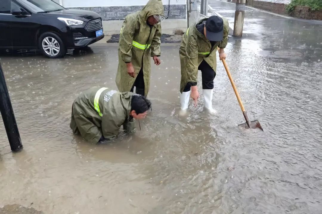 旺泉街道工作人员排查辖区雨箅子、低洼易积水区域的排水情况,随时清掏淤积物,保障排水畅通。