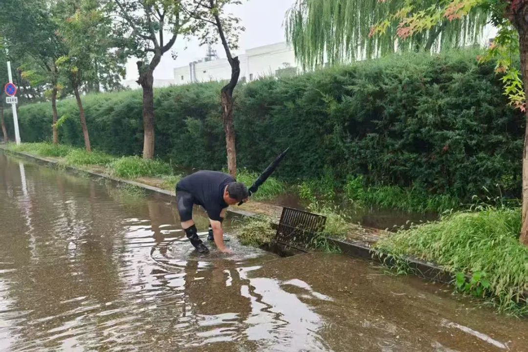 顺义市政控股在辖区重点点位开展应急值守,根据道路积水情况,及时打开雨水箅子、清掏堵塞物,提高雨水口收水能力,确保排水系统全线畅通。