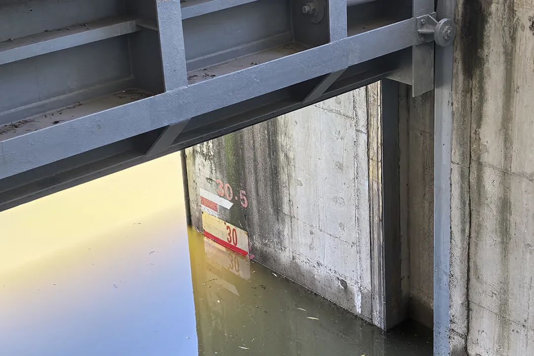 在河南村橡胶坝闸桥,水位下降的迹象同样明显。站在桥上,上游来水情况一目了然,从两侧水位刻度线的水位痕迹可以看出水位已下降。